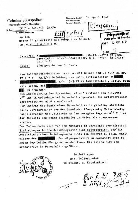 - Schreiben über eine Exekution in Griesheim